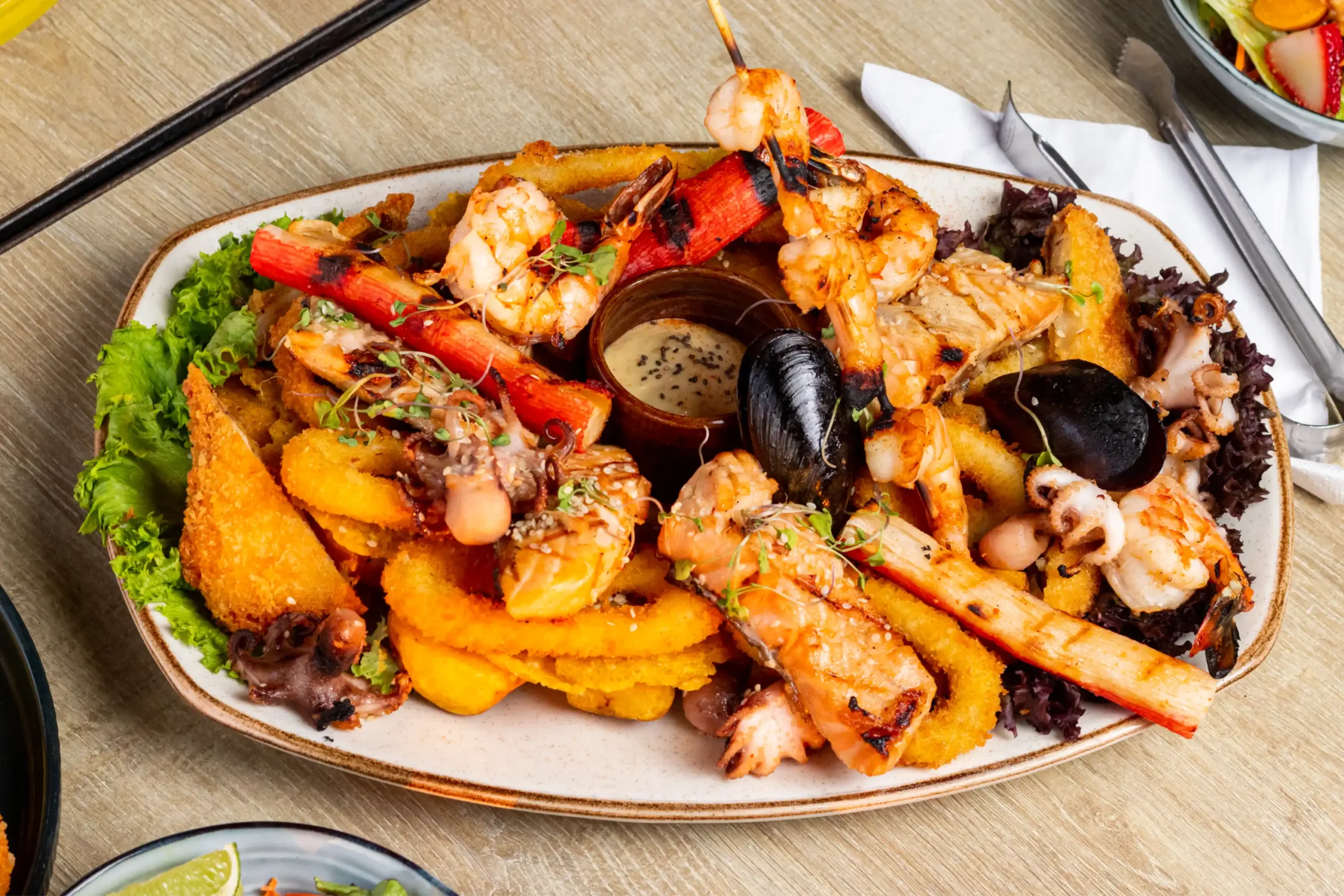 Espectacular combinacin de Frutos del Mar y Anillos de Calamar Apanados salteado con Arroz y Vegetales al Wok acompaado de Patacn